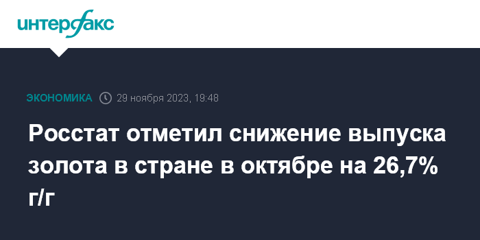 Росстат отметил снижение выпуска золота в стране в октябре на 26,7% г/г