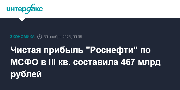 Москва. 30 ноября. INTERFAX.RU - Чистая прибыль "Роснефти" по МСФО в третьем квартале составила 467 млрд руб., сообщила компания.