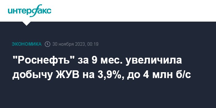 Москва. 30 ноября. INTERFAX.RU - Добыча жидких углеводородов "Роснефтью" за 9 месяцев составила 4 млн барр. в сутки, что на 3,9% выше год к году и преимущественно обусловлено возобновлением добычи на проекте "Сахалин-1", сообщила компания.