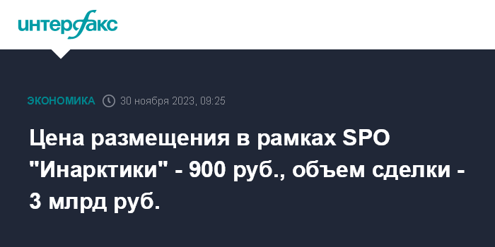 Цена размещения в рамках SPO "Инарктики" - 900 руб., объем сделки - 3 млрд руб.