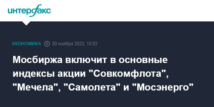 Мосбиржа включит в основные индексы акции "Совкомфлота", "Мечела", "Самолета" и "Мосэнерго"