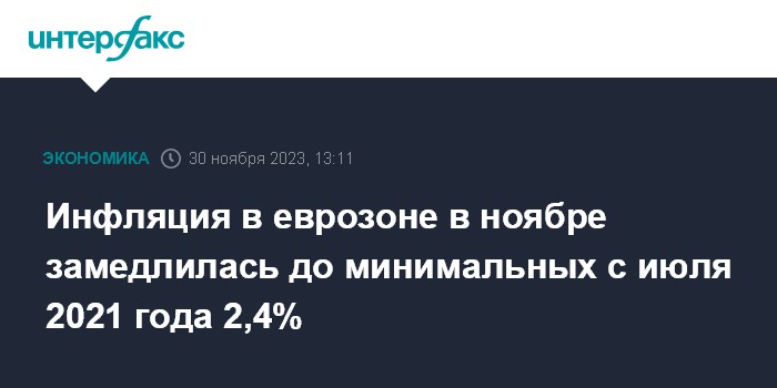 Инфляция в еврозоне в ноябре замедлилась до минимальных с июля 2021 года 2,4%
