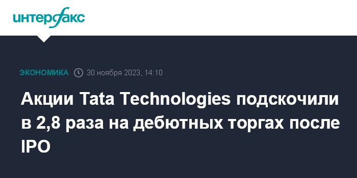 Москва. 30 ноября. INTERFAX.RU -Цена бумаг индийской инжиниринговой компании Tata Technologies взлетела на 180% в первый день торгов после первичного размещения на Национальной фондовой бирже в Мумбаи, пишет Financial Times.