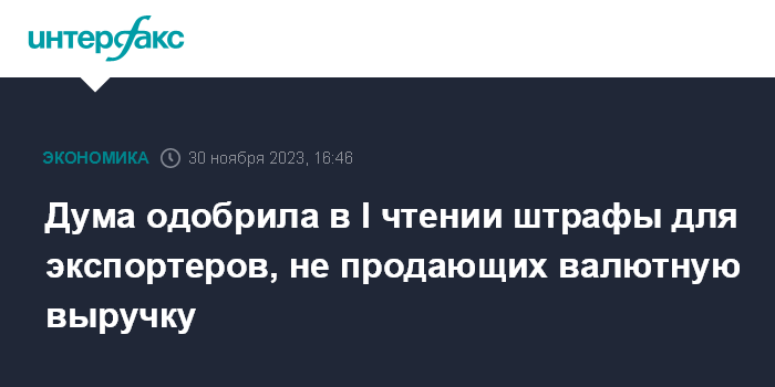 Москва. 30 ноября. INTERFAX.RU - Госдума приняла в первом чтении законопроект, который возвращает в КоАП действовавшие ранее штрафы за невыполнение обязанности по продаже экспортерами иностранной валюты на внутреннем рынке РФ, норма была отменена в 2013 г. Правительство и правовое управление парламента отмечают, что норма не может быть введена ретроспективно, как предлагают депутаты.
