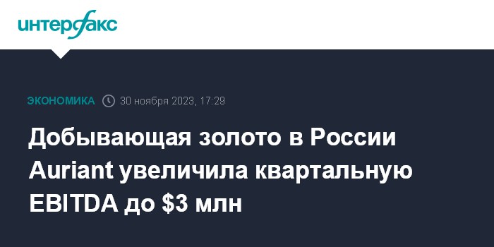 Москва. 30 ноября. INTERFAX.RU - Шведская Auriant Mining, добывающая золото в России, по итогам 9 месяцев 2023 года получила $4,7 млн EBITDA, сообщила компания.