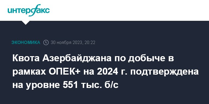 Москва. 30 ноября. INTERFAX.RU - Квота Азербайджана по добыче нефти в рамках сделки ОПЕК+ на 2024 год подтверждена в 551 тыс. б/с, сообщает Минэнерго страны.