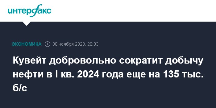 Кувейт добровольно сократит добычу нефти в I кв. 2024 года еще на 135 тыс. б/с