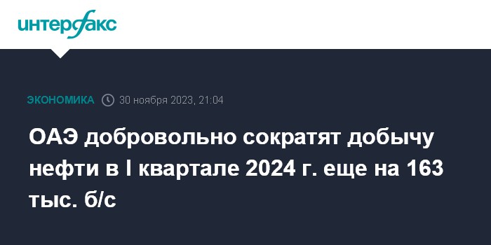 Москва. 30 ноября. INTERFAX.RU - Объединенные Арабские Эмираты добровольно снизят добычу нефти в первом квартале 2024 года еще на 163 тыс. б/с, говорится в сообщении государственного новостного агентства ОАЭ (WAM).