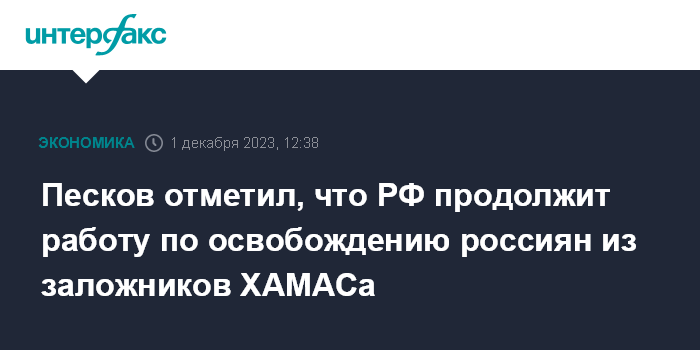 Москва. 1 декабря. INTERFAX.RU - Россия продолжит прикладывать усилия для освобождения россиян, взятых в заложники ХАМАС, заявил пресс-секретарь президента РФ Дмитрий Песков.