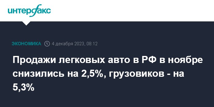 Продажи легковых авто в РФ в ноябре снизились на 2,5%, грузовиков - на 5,3%