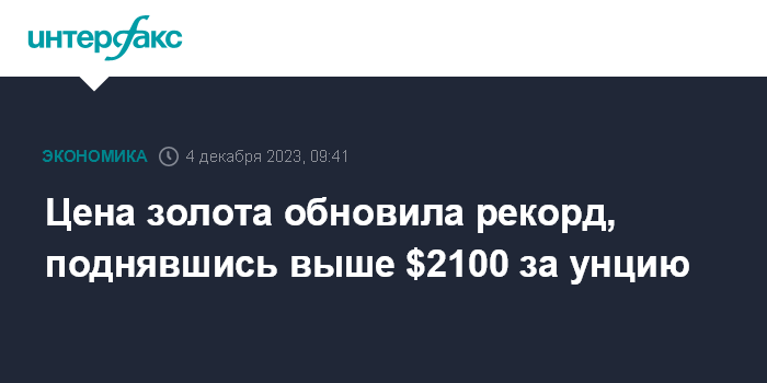 Москва. 4 декабря. INTERFAX.RU - Цена золота на спотовом рынке в понедельник превысила отметку в $2100 за унцию, побив рекорд, зафиксированный в августе 2020 года.