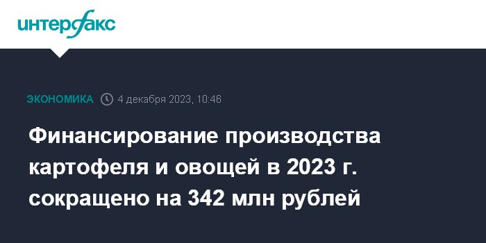 Согласно распоряжению правительства (подписано 30 ноября 2023 года), утвердившему изменения в распределении субсидий на 2023 год на стимулирование увеличения производства картофеля и овощей, их общая сумма составляет 4,658 млрд рублей. Ранее была утверждена и распределена сумма в 5 млрд рублей.