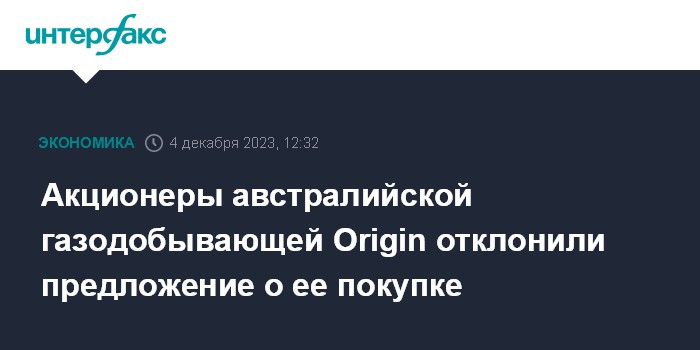 Москва. 4 декабря. INTERFAX.RU - Акционеры австралийской газодобывающей и электрогенерирующей Origin Energy, крупнейшего в стране поставщика энергии, отклонили предложение о ее покупке консорциумом инвесторов во главе с канадской инвесткомпанией Brookfield Asset Management. Об этом говорится в сообщении Origin на сайте Австралийской фондовой биржи.
