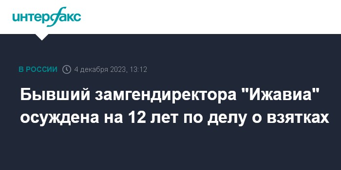 Москва. 4 декабря. INTERFAX.RU - Суд в Удмуртии признал бывшего заместителя генерального директора акционерного общества виновной в получении взятки и мошенничестве и приговорил ее к 12 годам колонии и штрафу в 17 млн рублей, сообщает пресс-служба регионального управления СКР.