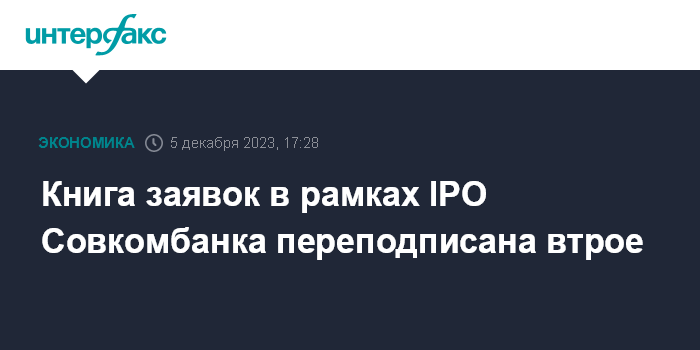 Книга заявок в рамках IPO Совкомбанка переподписана втрое