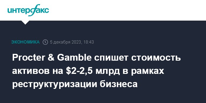 Москва. 5 декабря. INTERFAX.RU - Американский производитель потребительских товаров Procter & Gamble Co. (P&G) спишет стоимость активов на общую сумму $2-2,5 млрд в 2024 и 2025 фингодах.