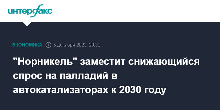 Москва. 5 декабря. INTERFAX.RU - "Норникель" рассчитывает к 2030 году полностью восполнить снижение спроса на палладий в автокатализаторах за счет вывода на глобальный рынок новых продуктов из своего портфеля, сообщил журналистам руководитель по развитию новых продуктов компании Дмитрий Изотов в кулуарах саммита COP28.