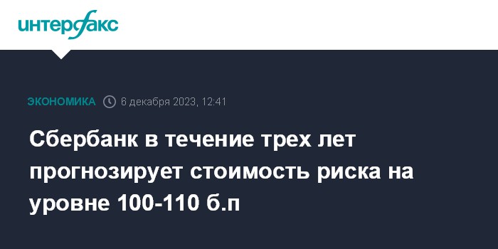 Москва. 6 декабря. INTERFAX.RU - Стоимость риска Сбербанка в 2024-2026 годах составит 100-110 базисных пунктов (б.п.), сообщил вице-президент, руководитель блока "Финансы" Сбербанка Тарас Скворцов.
