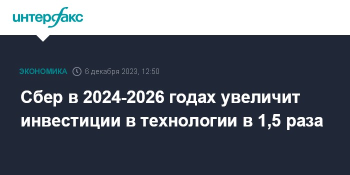 Москва. 6 декабря. INTERFAX.RU - Сбербанк в 2024-2026 годах увеличит инвестиции в технологии в полтора раза - до 450 млрд рублей, сообщил в среду вице-президент, руководитель блока "Финансы" Сбербанка Тарас Скворцов.
