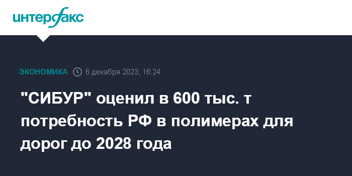 Москва. 6 декабря. INTERFAX.RU - Реализация федерального плана дорожной деятельности на 2023-2027 годы, предполагающего реконструкцию и строительство дорожной сети по всей России, потребует 600 тыс. тонн синтетических материалов. Такой прогноз представила компания "СИБУР" в "Доме полимеров" на международной выставке-форуме "Россия".
