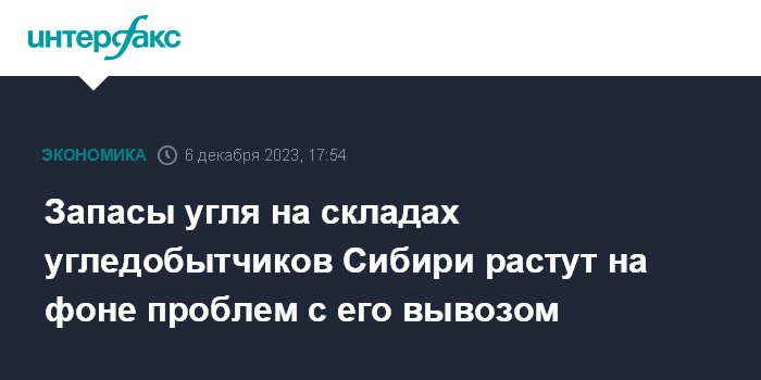 Москва. 6 декабря. INTERFAX.RU - Запасы угля на складах угледобывающих предприятий Сибири увеличиваются. Об этом говорится в декабрьском обзоре ЦБ РФ по региональной экономике.