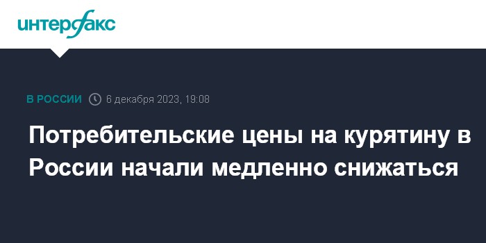 Москва. 6 декабря. INTERFAX.RU - Потребительские цены на мясо кур за неделю с 28 ноября по 4 декабря снизились на 0,1%, сообщил Росстат.