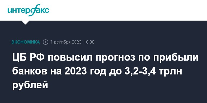 Москва. 7 декабря. INTERFAX.RU - Прибыль банковского сектора в 2023 году составит 3,2-3,4 трлн рублей, говорится в аналитическом обзоре ЦБ РФ.