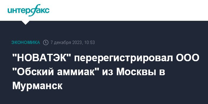 "НОВАТЭК" перерегистрировал ООО "Обский аммиак" из Москвы в Мурманск