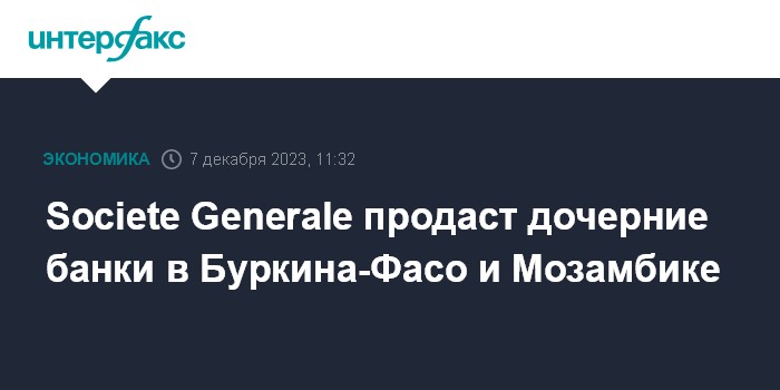 Москва. 7 декабря. INTERFAX.RU - /Societe Generale продаст мажоритарные пакеты акций своих "дочек" в Буркина-Фасо и Мозамбике финкомпании Vista Group, что станет последним шагом французского банка по сокращению присутствия в Африке, пишет MarketWatch.