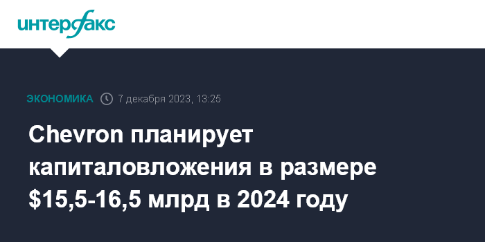 Москва. 7 декабря. INTERFAX.RU - Американская нефтекомпания Chevron Corp. планирует капиталовложения на 2024 год в размере $15,5-16,5 млрд, значительная часть которых придется на проекты в Пермском бассейне и в Мексиканском заливе.