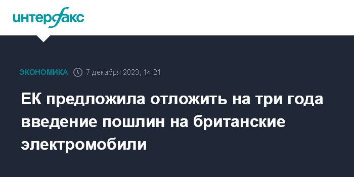 Москва. 7 декабря. INTERFAX.RU - Европейская комиссия предложила отложить на три года, до 31 декабря 2026-го, введение 10-процентной пошлины на торговлю электромобилями и аккумуляторами для них между Европейским союзом и Великобританией.