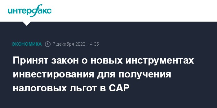 Принят закон о новых инструментах инвестирования для получения налоговых льгот в САР