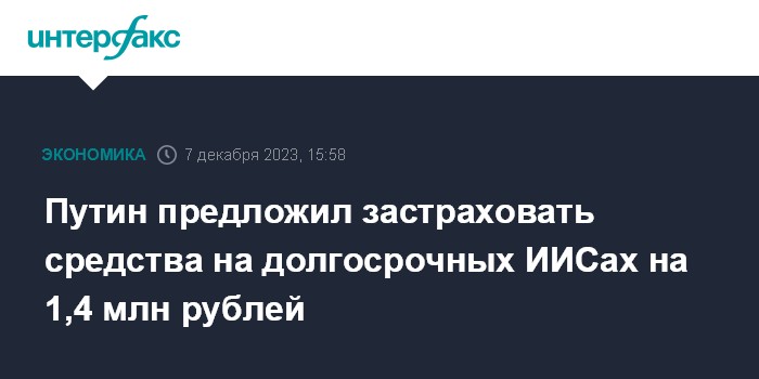 Москва. 7 декабря. INTERFAX.RU - Средства россиян на долгосрочных индивидуальных инвестиционных счетах (ИИС) должны быть застрахованы по аналогии с банковскими вкладами на сумму в 1,4 млн рублей, заявил президент РФ Владимир Путин.