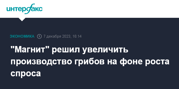 "Магнит" является одним из крупнейших производителей культивированных грибов в России, это одна из перспективных категорий. Комплекс по выращиванию шампиньонов производит 7 тысяч тонн продукции в год. В этом году, по оценке экспертов компании, в целом удельное потребление покупателями сети "Магнит" грибов выросло на 20-30%", - отметили в компании.