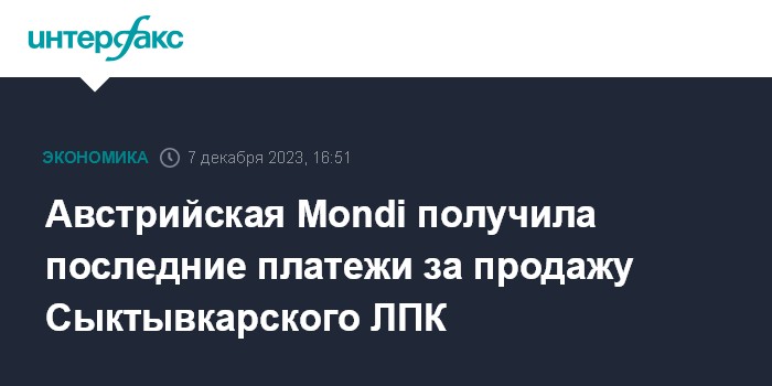 Москва. 7 декабря. INTERFAX.RU - Австрийская группа Mondi plc получила последние два транша суммарно в объеме 23 млрд рублей за продажу своего главного российского актива АО "Монди Сыктывкар" (Сыктывкарский ЛПК), говорится в пресс-релизе иностранной компании.