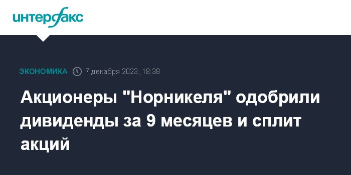 Также акционеры "Норникеля" на внеочередном собрании 7 декабря поддержали дробление акций с коэффициентом 100, то есть одна обыкновенная акция конвертируется в 100 акций. Сплит проводится ради повышения инвестиционной привлекательности бумаг компании и их доступности для широкого круга розничных инвесторов.