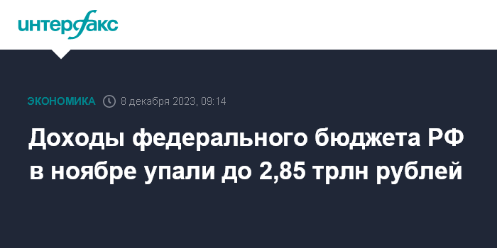 Доходы федерального бюджета РФ в ноябре упали до 2,85 трлн рублей