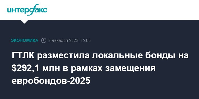 Москва. 8 декабря. INTERFAX.RU - "Государственная транспортная лизинговая компания" (ГТЛК) разместила локальные бонды на $292,1 млн в рамках замещения выпуска еврооблигаций с погашением в 2025 году, сообщил эмитент на ленте раскрытия информации.