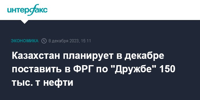 Казахстан планирует в декабре поставить в ФРГ по "Дружбе" 150 тыс. т нефти