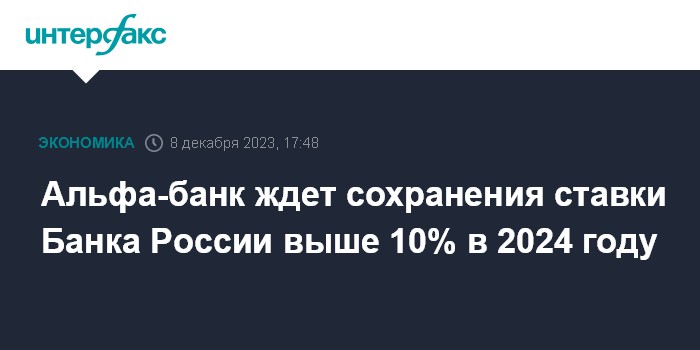 Москва. 8 декабря. INTERFAX.RU - Экономисты Альфа-банка ожидают сохранения ключевой ставки Банка России на уровне выше 10% в 2024 году, говорится в их обзоре.