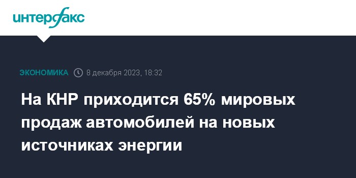 Москва. 8 декабря. INTERFAX.RU - Продажи автомобилей на новых источниках энергии (NEV) в мире в январе-сентябре 2023 года составили 9,75 млн единиц, причем на Китай пришлось 6,28 млн из этого объема, или свыше 64%, сообщает "Синьхуа" со ссылкой на данные, представленные на Всемирном конгрессе автомобилей на новых источниках энергии.