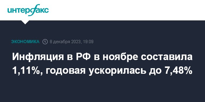 Годовая инфляция, по данным Росстата, в ноябре 2023 года ускорилась до 7,48% (аналитики ожидали около 7,6%) с 6,69% на конец октября, 6,00% на конец сентября, 5,15% на конец августа, 4,30% на конец июля, 3,25% на конец июня, 2,51% на конец мая, 2,31% на конец апреля, 3,51% на конец марта после 10,99% на конец февраля, 11,77% на конец января и 11,94% на конец декабря 2022 года.