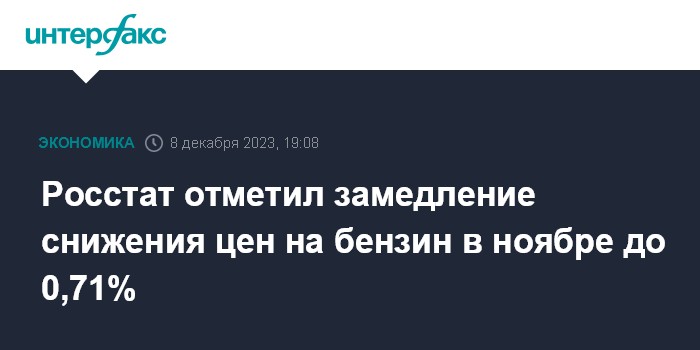 Москва. 8 декабря. INTERFAX.RU - В ноябре 2023 года в России потребительские цены на бензин снизились относительно октября на 0,71% после падения в октябре 2023 года на 1,57%, когда отрицательная динамика была зафиксирована впервые с февраля этого года, сообщил Росстат.