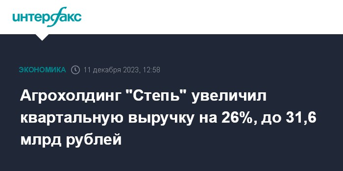 Москва. 11 декабря. INTERFAX.RU - В III квартале 2023 года агрохолдинг "Степь" (входит в АФК "Система") увеличил выручку на 25,5% в годовом исчислении, до 31,6 млрд рублей, сообщили "Интерфаксу" в пресс-службе агрохолдинга, отметив, что это неаудированные результаты.