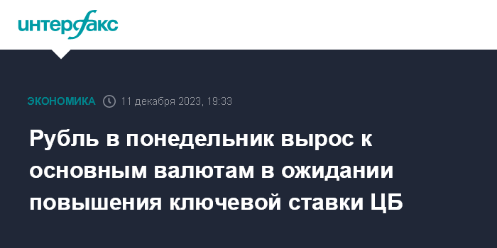 Как отмечают эксперты "Интерфакс-ЦЭА", рубль вырос к основным валютам по итогам торгов понедельника перед заседанием Банка России, на котором, как ожидается, вновь будет повышена ключевая ставка. Заседание совета директоров Банка России состоится в пятницу, 15 декабря, по его итогам пройдет пресс-конференция председателя Банка России Эльвиры Набиуллиной.