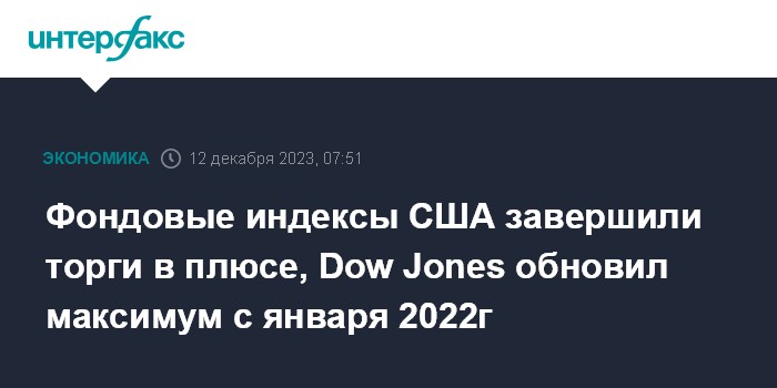 Фондовые индексы США завершили торги в плюсе, Dow Jones обновил максимум с января 2022г