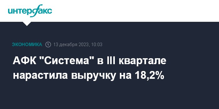 Москва. 13 декабря. INTERFAX.RU - Консолидированная выручка ПАО АФК "Система" по итогам III квартала 2023 года составила 280,8 млрд рублей, что на 18,2% превышает показатель аналогичного периода 2022 года, сообщила корпорация.