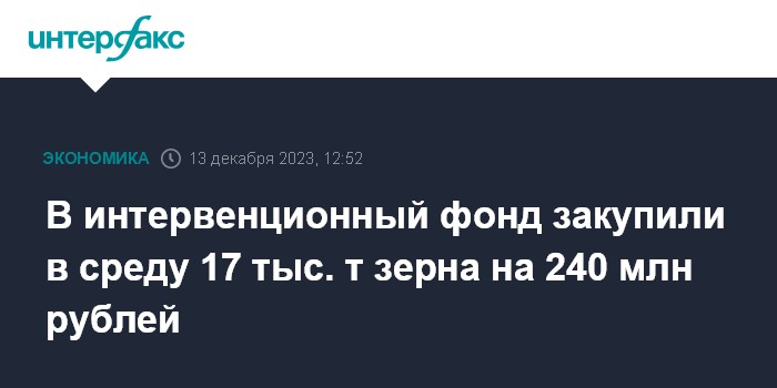 Москва. 13 декабря. INTERFAX.RU - Госзакупки зерна в среду пополнили интервенционный фонд РФ на 17,01 тыс. тонн (на 239,9 млн рублей). Об этом сообщается в пресс-релизе Национальной товарной биржи (НТБ, входит в группу Московская биржа).