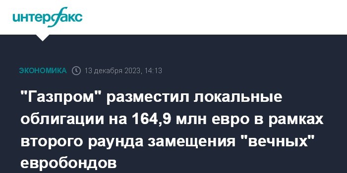 "Газпром" разместил локальные облигации на 164,9 млн евро в рамках второго раунда замещения "вечных" евробондов