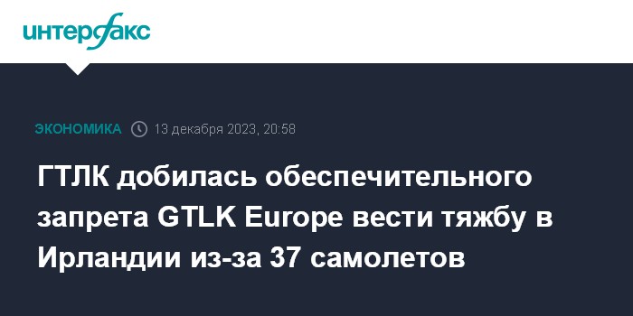 Москва. 13 декабря. INTERFAX.RU - Арбитражный суд ЯНАО удовлетворил заявление "Государственной транспортной лизинговой компании" (ГТЛК) о принятии обеспечительных мер в виде запрета ее ирландской структуре GTLK Europe DAC и ее ликвидаторам продолжать разбирательство в Высоком суде Ирландии с целью изъятия у ГТЛК 37 самолетов.